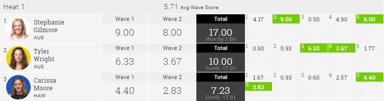 Heat 1: Julian Wilson (AUS) 15.07, Wiggolly Dantas (BRA) 8.60, Ryan Callinan (AUS) 8.50