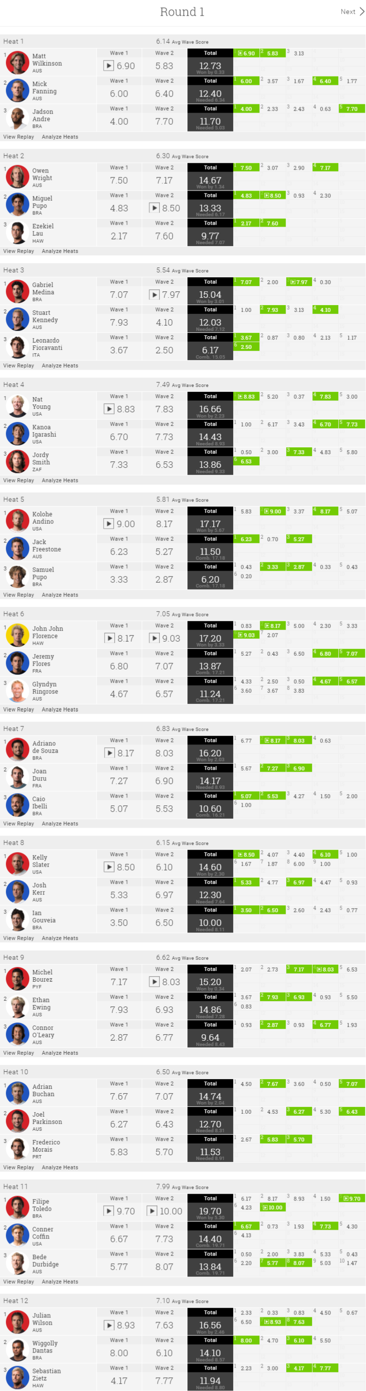 フィリペ以外では、ジョンジョン・フローレンス、オーウェン・ライト、ケリー・スレーター、ガブリエル・メディナ、コロヘ・アンディーノなどが順当に勝ち上がり、番狂わせでラウンド2行きとなったのはミック・ファニングやジョーディ・スミス。