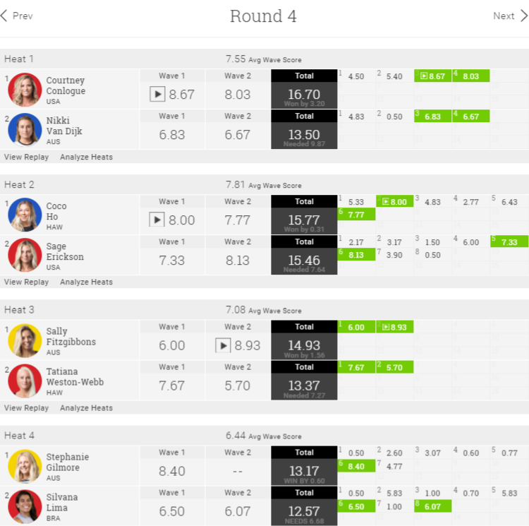 メンズのラウンド1終了後に開催されたウイメンズのラウンド4。敗者復活戦となるラウンド4は順当すぎるほどの結果で、コートニー・コンローグ、ココ・ホー、サリー・フィッツギボンズ、ステファニー・ギルモアがクオーターファイナル進出を決めました。
