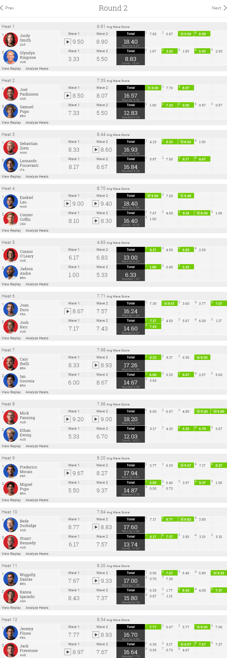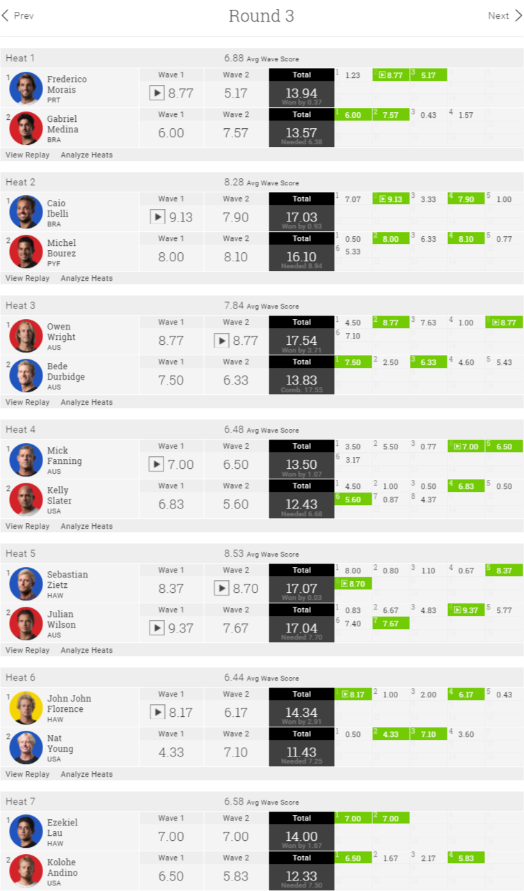 敗者復活戦のラウンド2では大きな番狂わせはなかったものの、ラウンド3にてガブリエル・メディナ、ケリー・スレーター、ジュリアン・ウィルソン、コロヘ・アンディーノが早くも敗退の結果に。