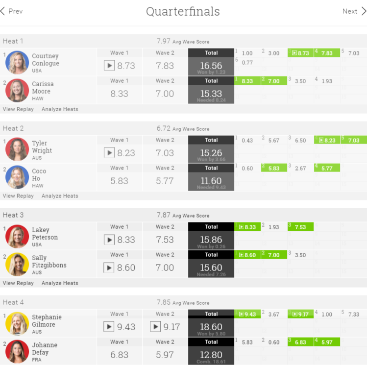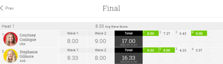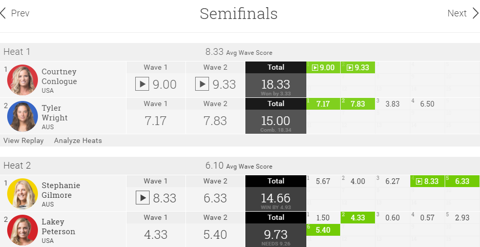 セミファイナルでは、ディフェンディングチャンピオンのコートニーが9ポイント台を二本揃える大活躍。タイラー・ライトと対戦したコートニーは、ヒート前半は全く波に乗れない展開でした。