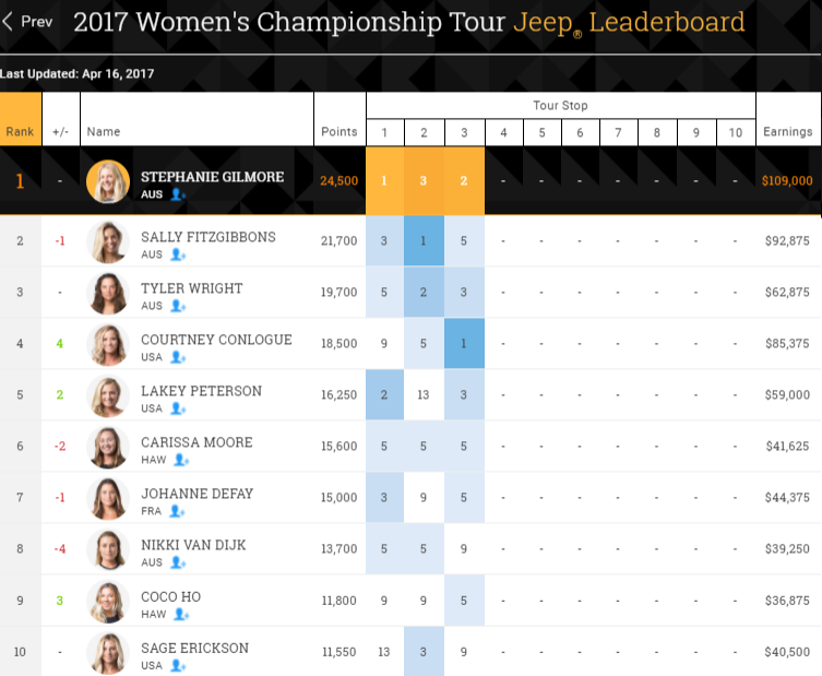今回のCT第3戦を終えて、ウイメンズのCTランキングは以下の通り。