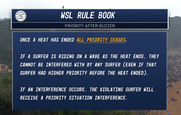 ヒート終了後はプライオリティが消滅し、ヒート終了後に他のサーファーにドロップインした場合はヒート中同様のインターフェアと見なされるとのこと。