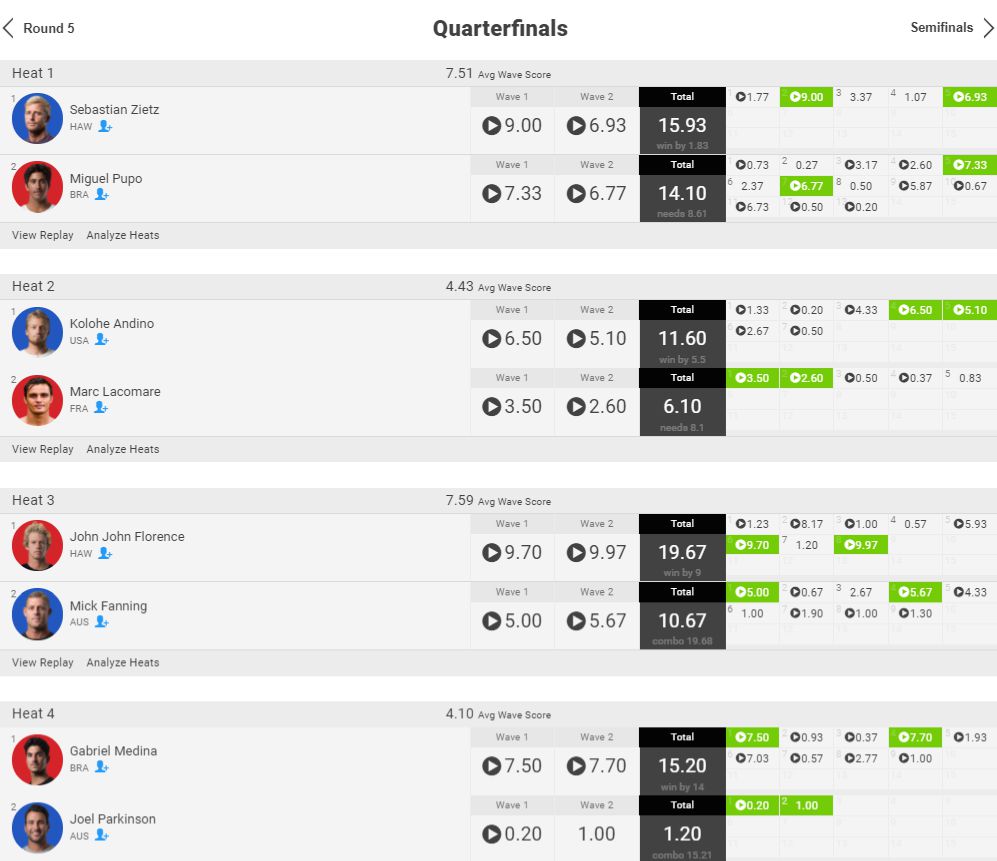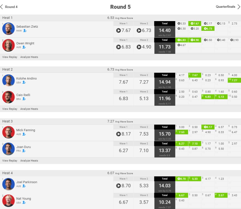ミック・ファニングと対戦したクオーターファイナルでは、終わってみれば本日唯一9ポイント台を二本揃えるトータルハイエストスコア19.67をマークと絶好調。