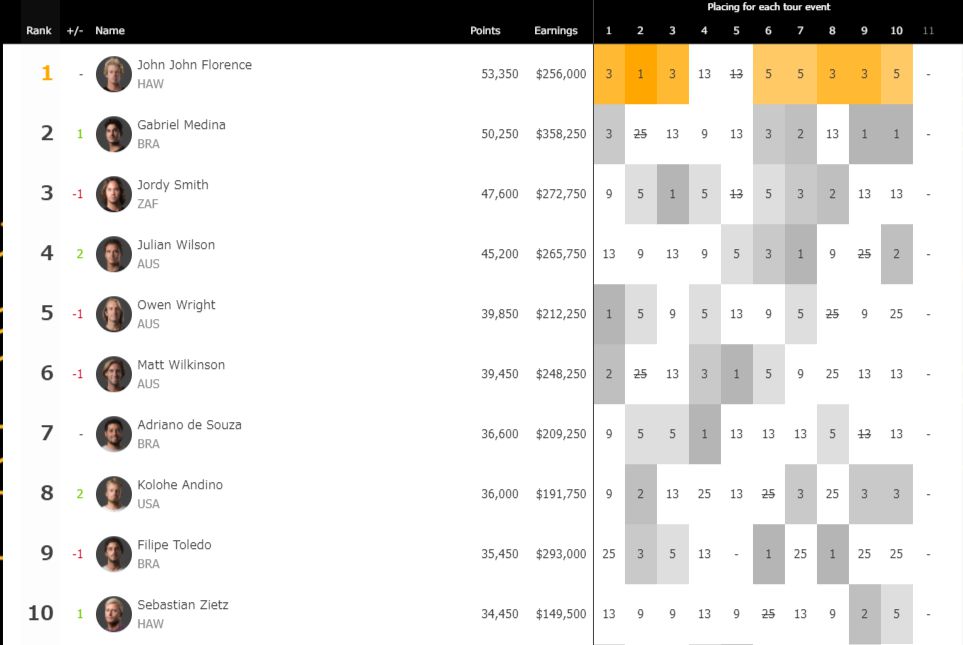 ジョンジョンの敗退が決まった時点で、タイトルレースは最終戦となるハワイイベントへと持ち越されることになりました。