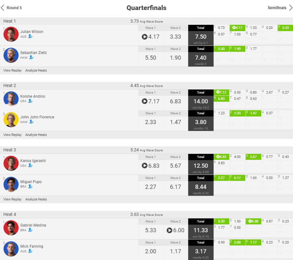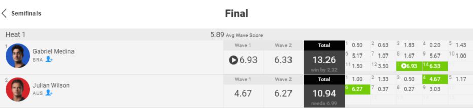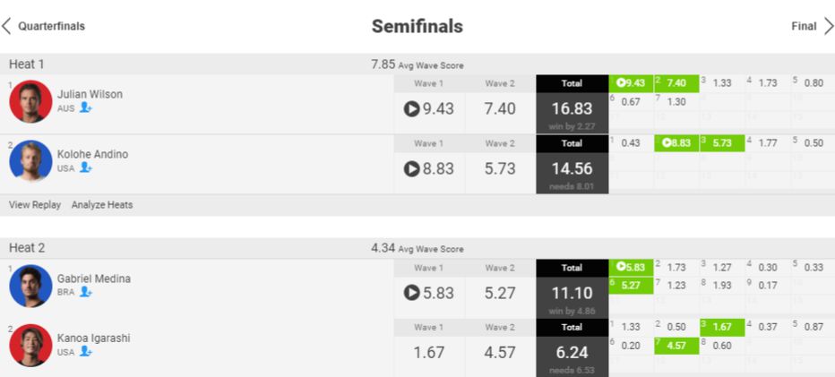 イベント自体はタイトルレースに残っているジュリアン・ウィルソンとガブリエル・メディナがファイナルへと勝ち進むことに。