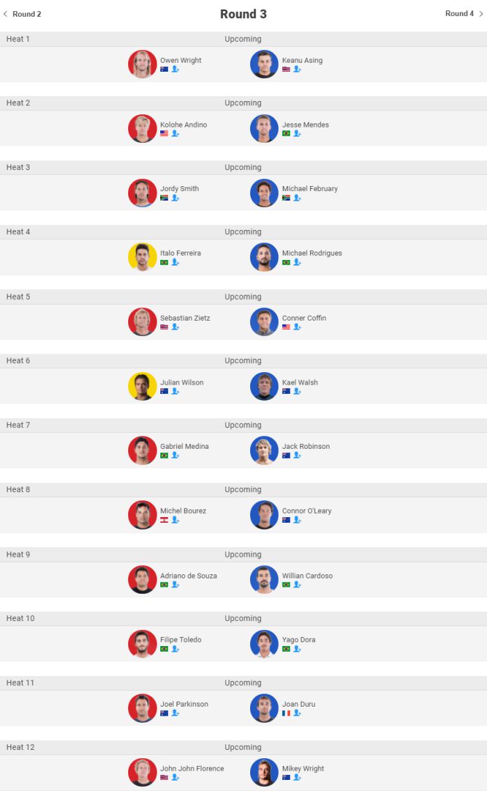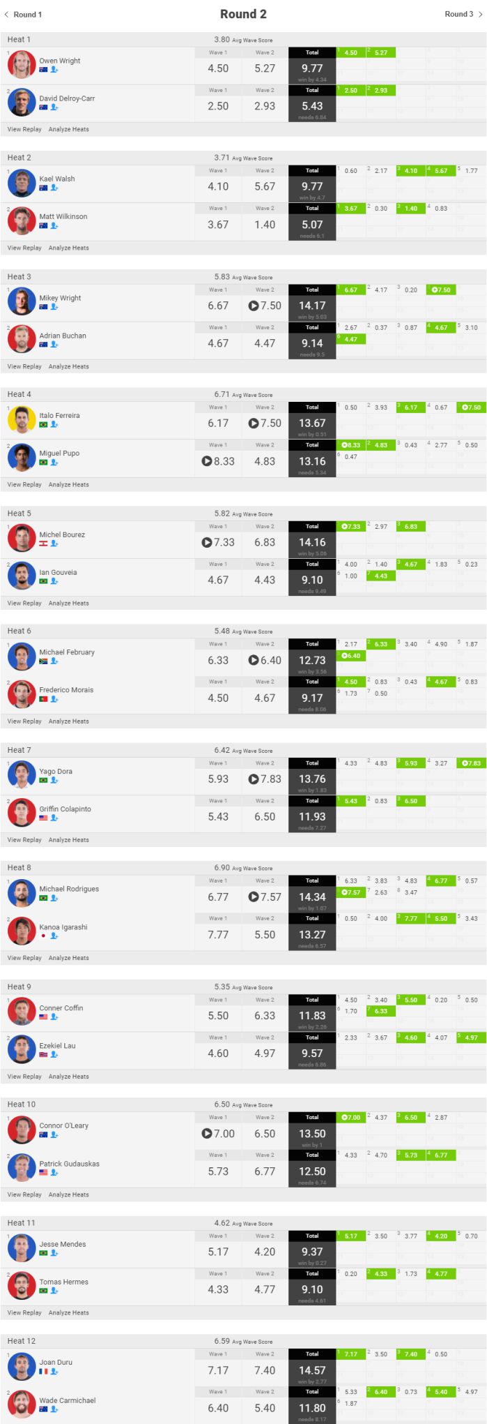 さて、ラウンド2のヒート表は、ラウンド1で敗退したトップシードがオープニングヒートから出場し、まずはオーウェン・ライトがトライアル優勝のデヴィッド・デルロイ・カーに勝利。