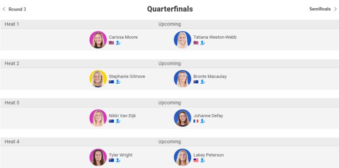 ラウンド3に進むと、カリッサ・ムーア、ステファニー・ギルモア、ニッキ・ヴァン・ダイク、タイラー・ライトが3人ヒートで1位となることに。