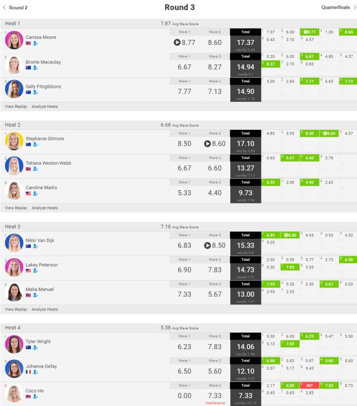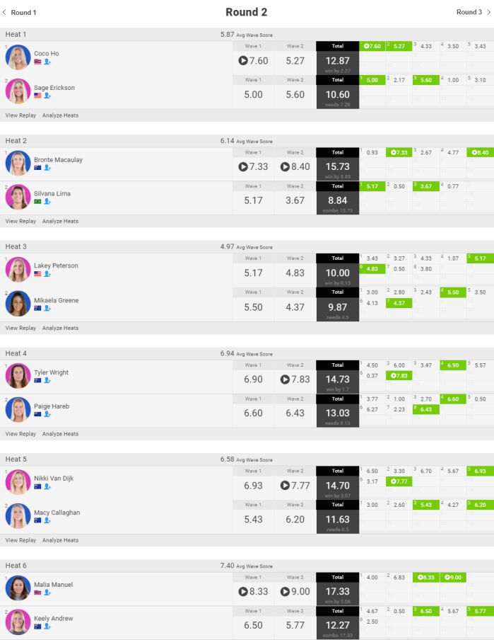 そのラウンド2では、タイラー・ライトやレイキー・ピーターソンが順当にラウンドアップを決めた一方、今季は調子の良かったシルヴァナ・リマが敗退。
