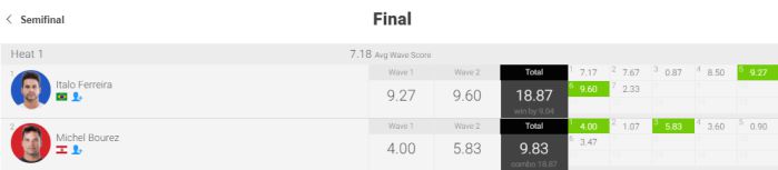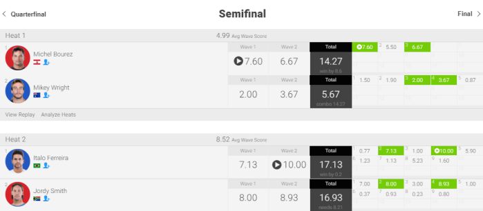 期待のワイルドカードであるマイキー・ライトがヒート1で登場。しかし、マイキーはパワー不足の波に苦戦を強いられる一方、コンペティターとしての経験値が高いミシェル・ボウレズが手堅くスコアを重ねて勝利。