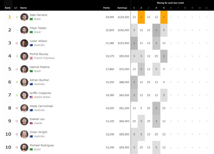 もう一つ興味深い点として、CTサーファーではなくワイルドカード出場ですでに4戦(今イベントが第5戦)出場しているマイキー・ライトがCTランク12位に付けています(笑)。