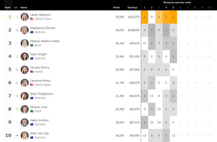 メンズ同様、今イベント優勝で今季2勝目を上げたレイキー・ピーターソンが、僅差でステファニー・ギルモアのポイントを上回り、次なるイベントではイエロージャージとなります。