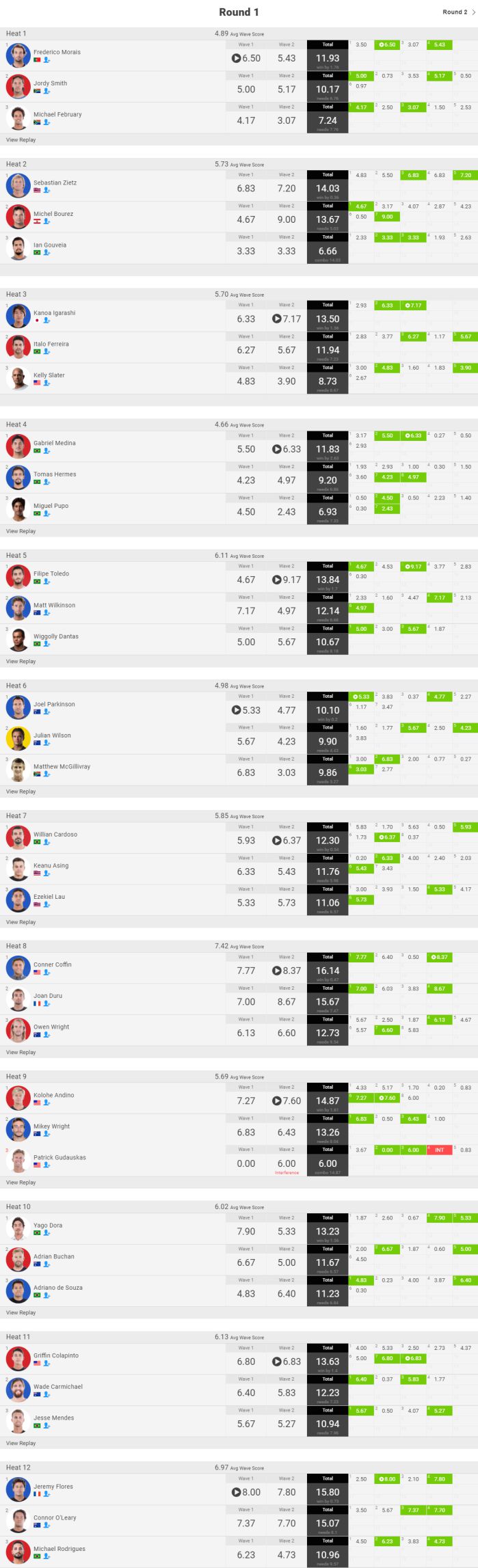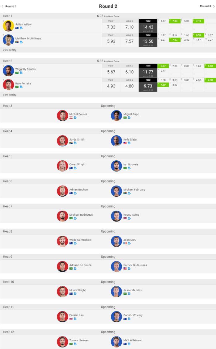 引退発表をしたパーコとケリーは、パーコがラウンド1を1位通過してラウンド3へ、ケリーはラウンド2送りとなってジョーディ・スミスとの対戦となります。