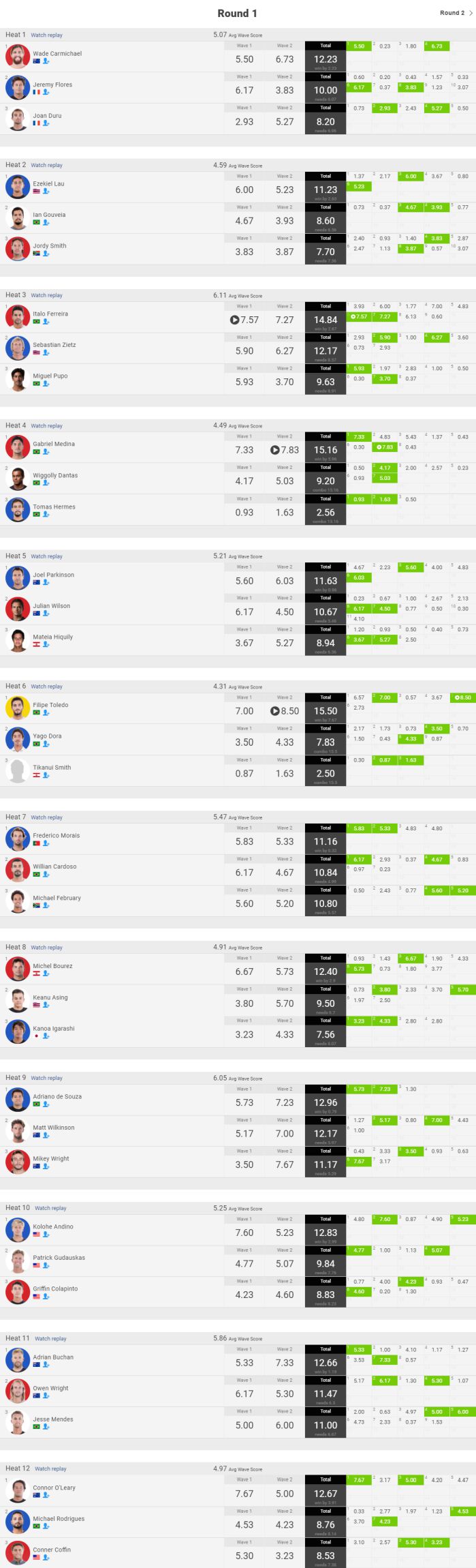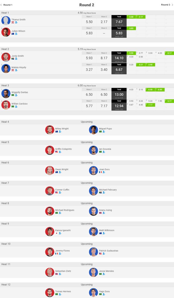 本日のシングルハイエストスコア8.50とトータルハイエストスコアの15.50はフィリペのスコアとなり、1位通過でラウンド3進出を決めました。