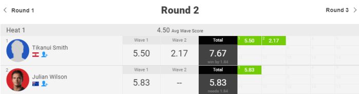 スーパースローヒートと言われるほどセットが入ってこなかった事が原因であり、ジュリアンが乗った波数はわずか一本。スコア差は1.84ポイントで、プライオリティを持って波を待ち続けた中での悔やまれる結果となりました。