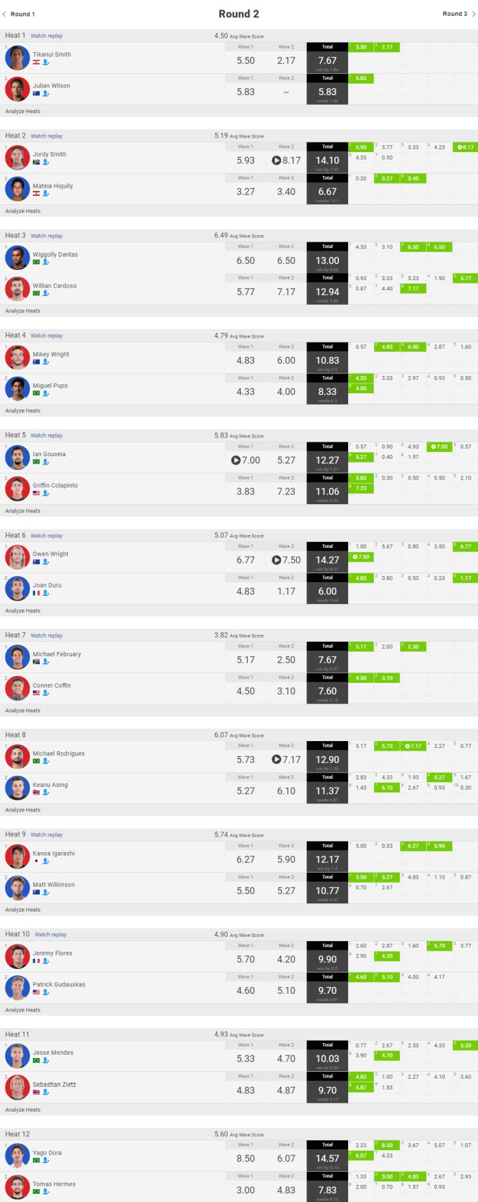 ロースコアで僅差の勝負が目立つ展開となった本日のオープニングヒートでは注目のマイキー・ライトが出場し、ミゲル・プポを相手にラウンドアップを決めました。