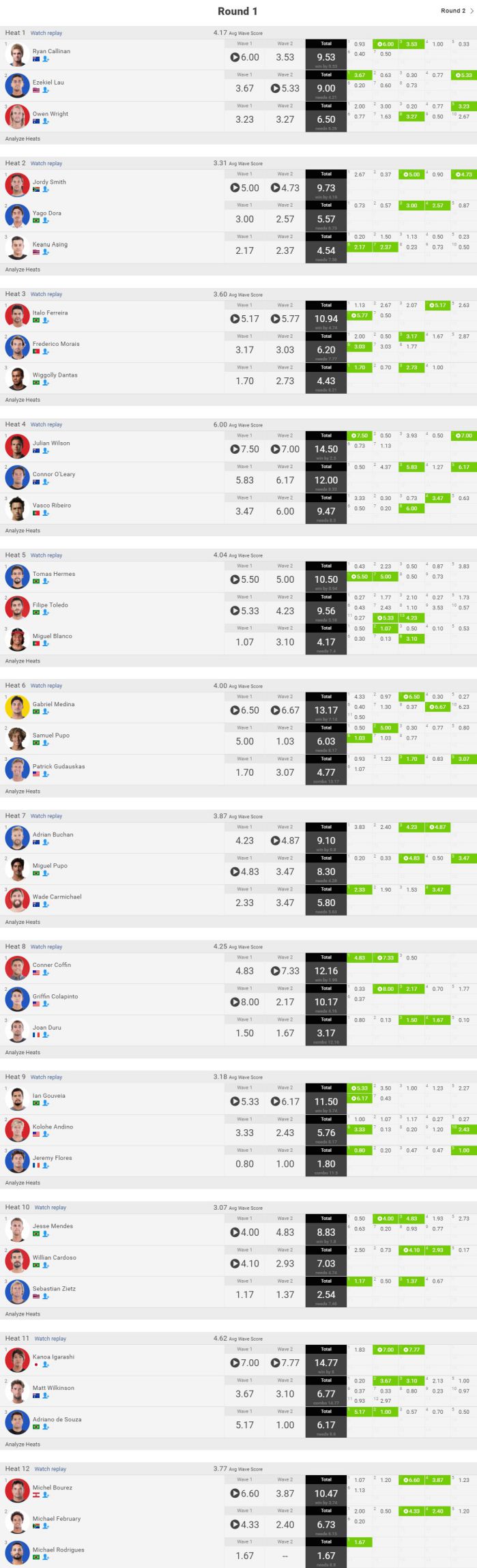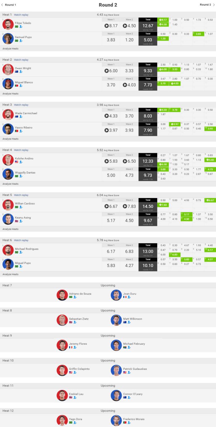 さて、タイトルレースについてはガブリエル・メディナ、フィリペ・トレド、ジュリアン・ウィルソンの3名は無事にラウンド3進出を決定。