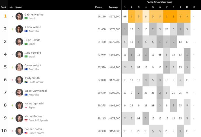 ランキング上位に変化はほぼなく、フィリペ・トレドとジュリアンが同率になった程度ですね。