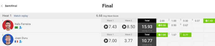 波のフェイスでサーフィンするジョアンは、リップを越えたマニューバを繰り出すイタロには追い付くことができず、イタロがベルズビーチとバリ島に続き、今シーズン3度目の優勝を果たしました。