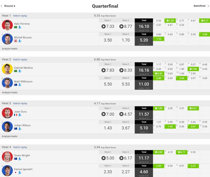 クオーターファイナルからスタートした本日、タイトルレースを争うガブリエル・メディナはエアゲームでマット・ウィルキンソンを撃破。