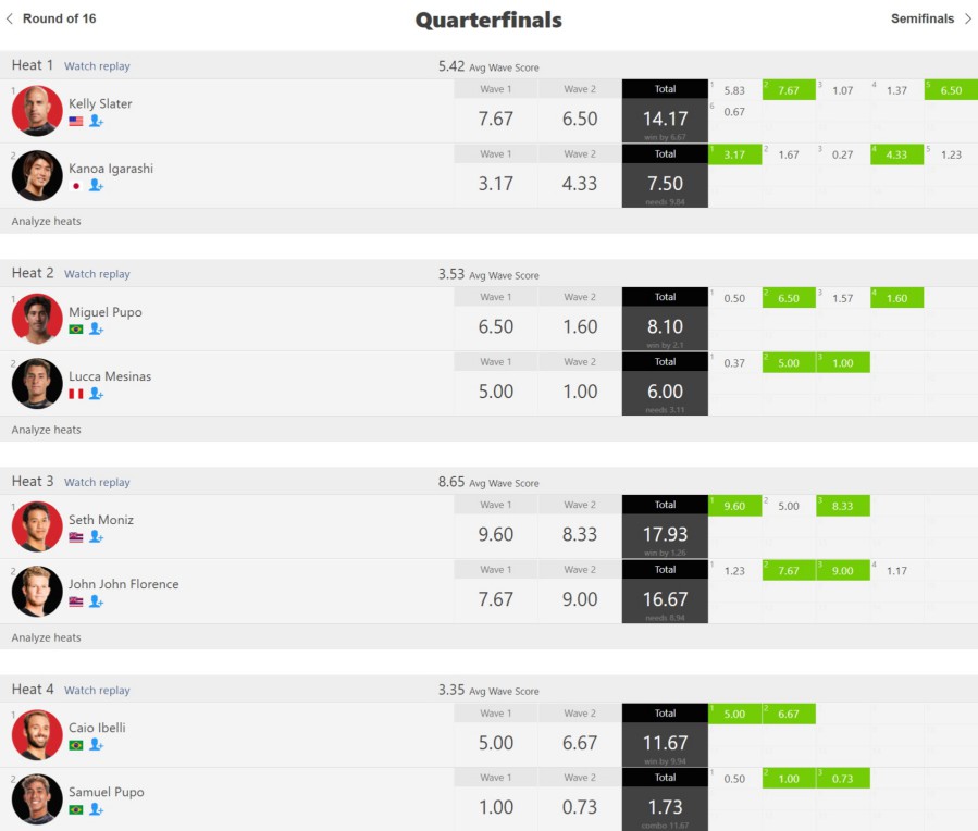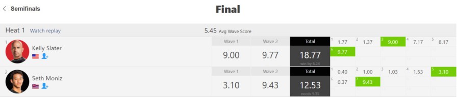 後付けではあるのですが、その後のカイオ・イベリとサミュエル・プポが対戦したヒート4のスコアを見ても、ケリーとセスのスコアがずば抜けているのは明白でした。
