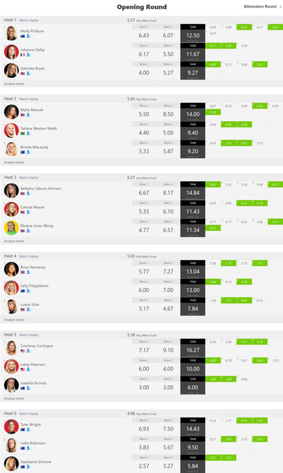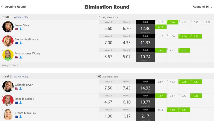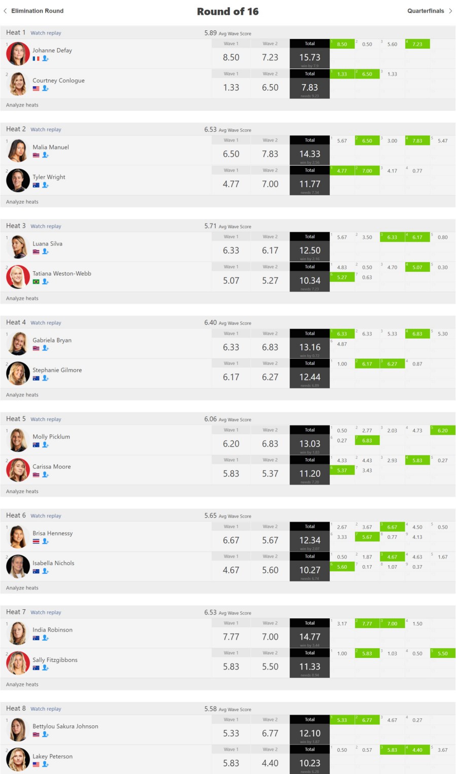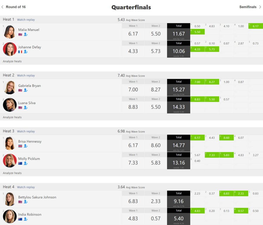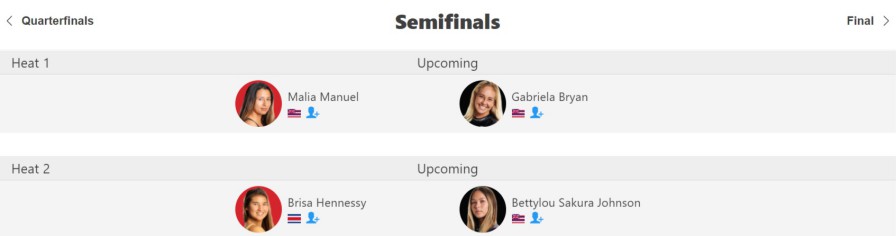 僅差のヒートが多かったクオーターファイナルでは、マリア・マニュエル、ガブリエラ・ブライアン、ブリッサ・ヘネシー、ベティルー・サクラ・ジョンソンが勝ち上がる結果に。