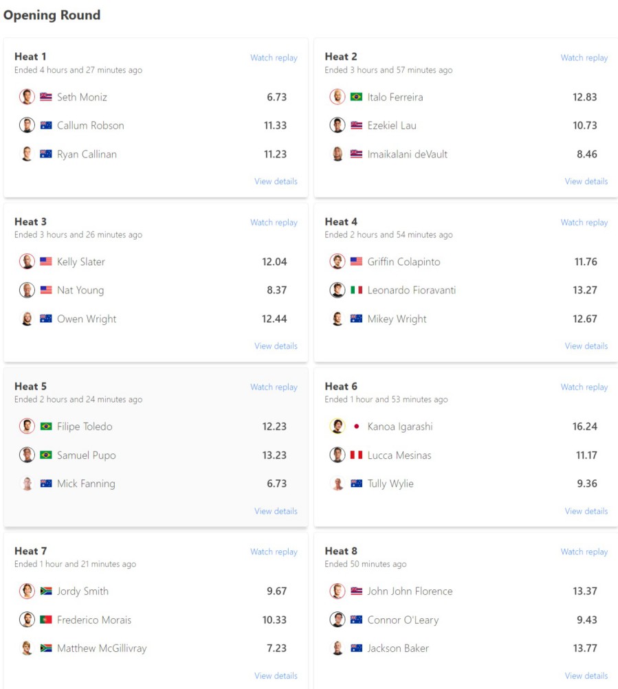 シード順位から見た上での番狂わせとしては、ヒート4に出場したグリフィン・コラピントが3位敗退でラウンド2送りとなりました。