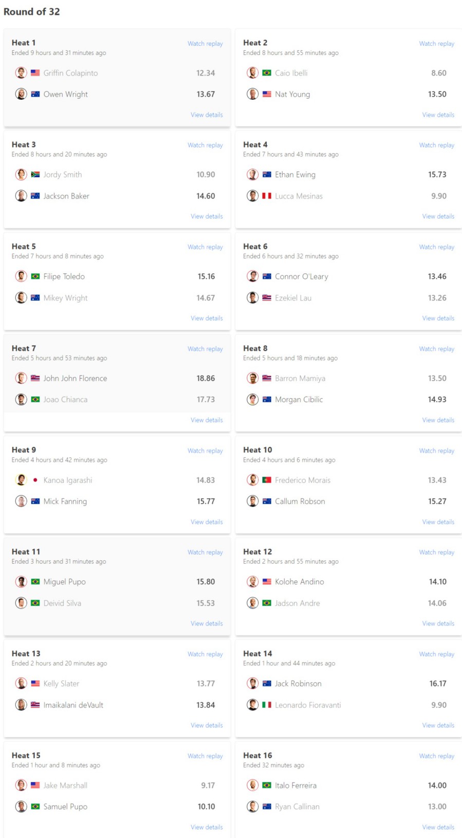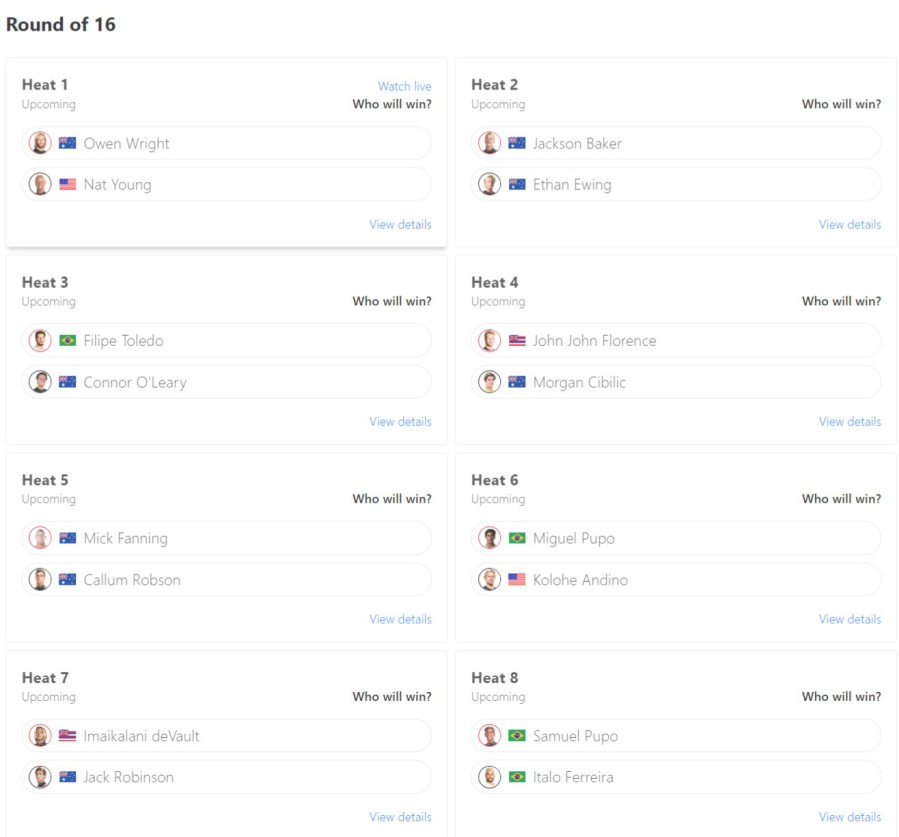 カノアが波に乗った時は逆転に必要なスコアが6.85でしたが、その後にコールされたミックのスコアは8.77とリードを伸ばしたので、カノアは8.00をスコアしたものの逆転は叶わず早期敗退となりました。