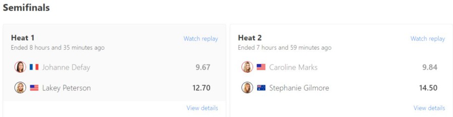 優勝したステファニー・ギルモアは、セミファイナルでキャロリン・マークス、ファイナルではレイキー・ピーターソンを破っての勝利。