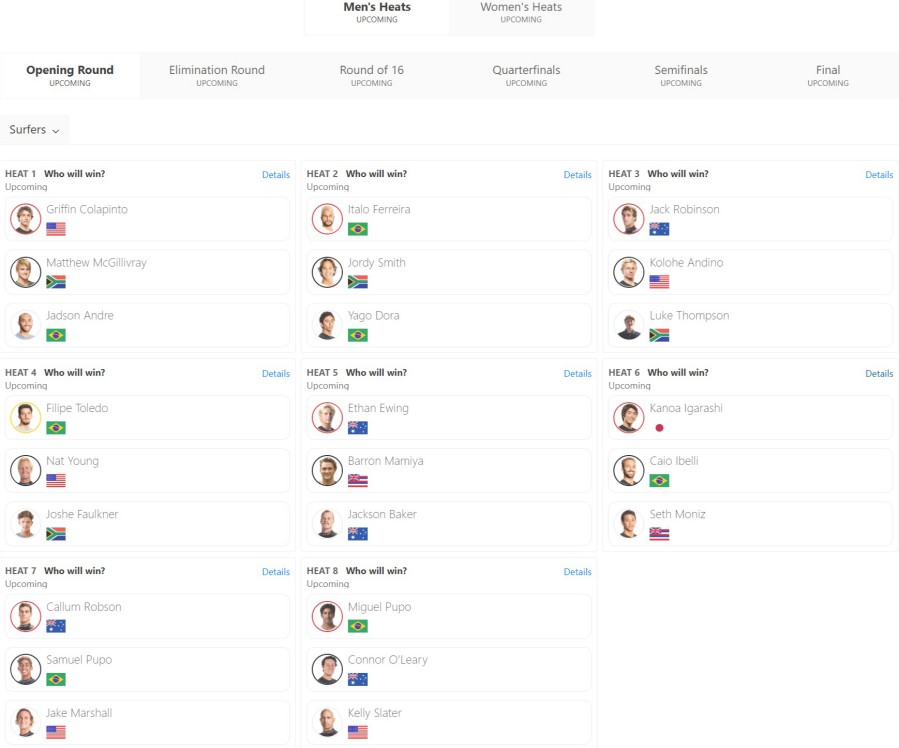 ブラジルでの前イベントを欠場したものの、今イベントで復帰となるのはケリー・スレーター、セス・モニーツ、バロン・マミヤ。
