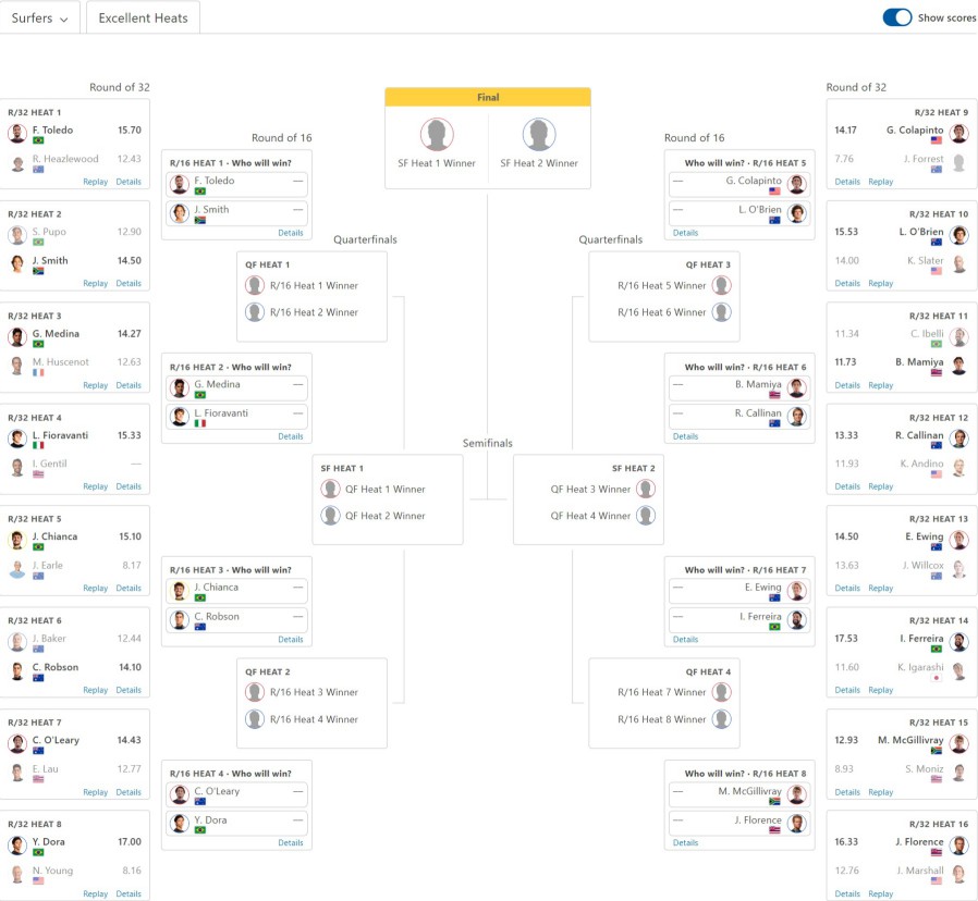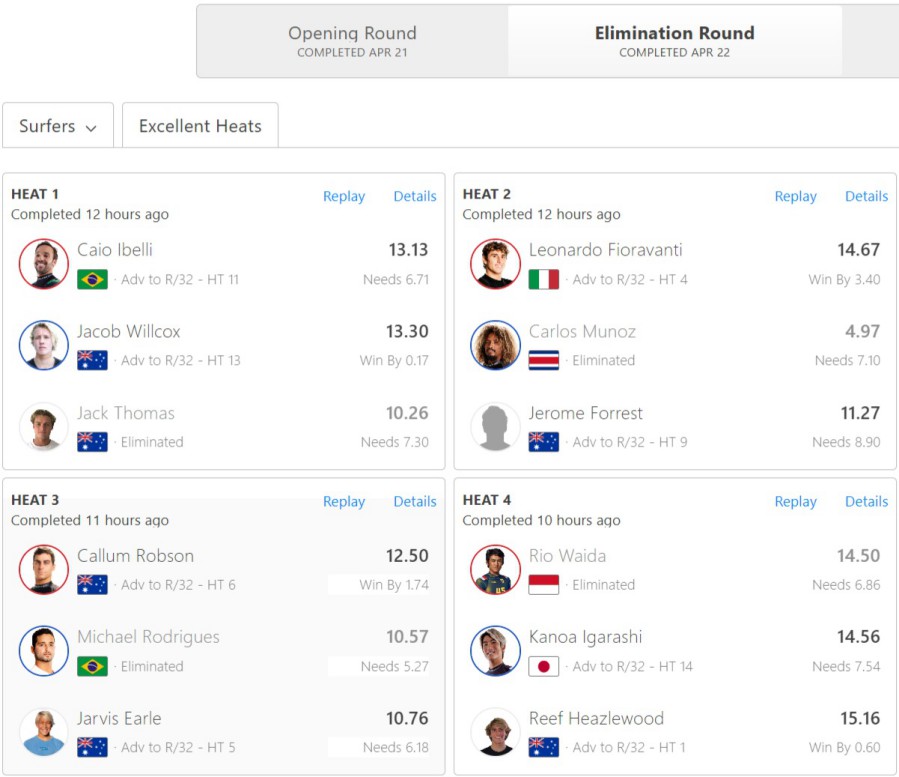最大の注目となったのは11×ワールドチャンピオンのケリー・スレーターの進退で、結果的に接戦の末にケリーはリアム・オブライエンに敗退することに。
