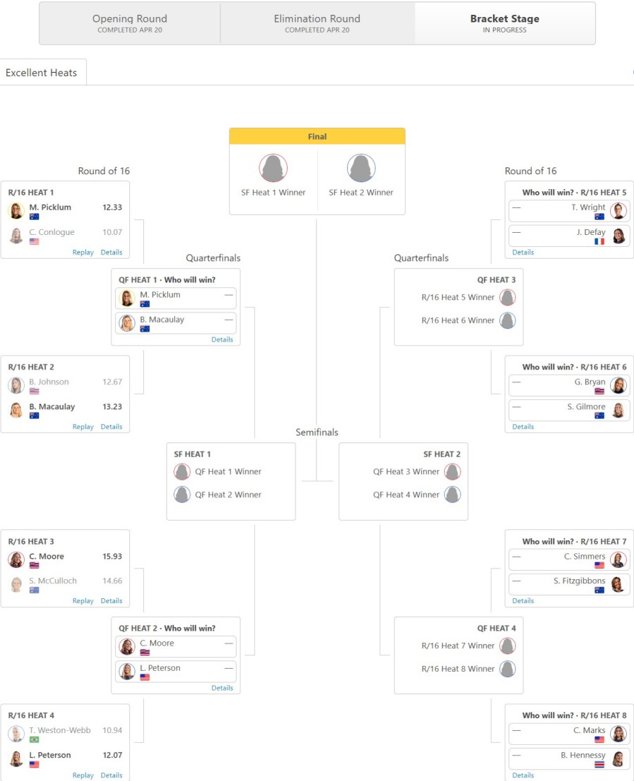 ただし、対戦相手であるルーキーのソフィー・マコーロックも敗れはしたものの14.66という本日のセカンドハイエストスコアと大勝負を演じました。