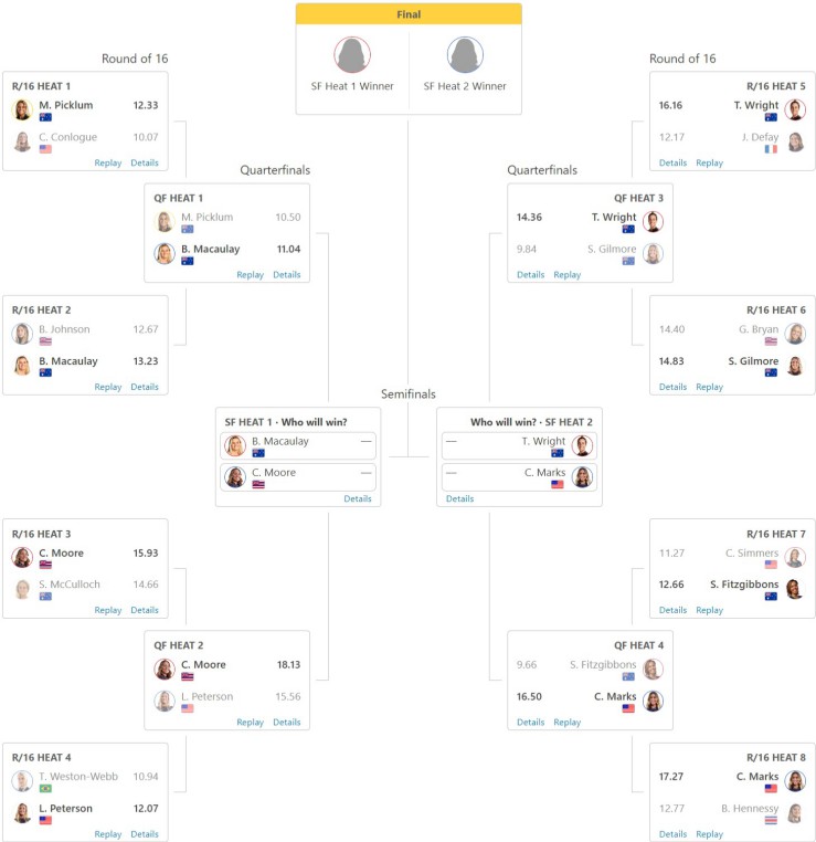 クオーターファイナルに進むと、ヒート1で現ランキングトップのモリー・ピクラムがブロンテ・マコーリーに敗退の大波乱が発生。