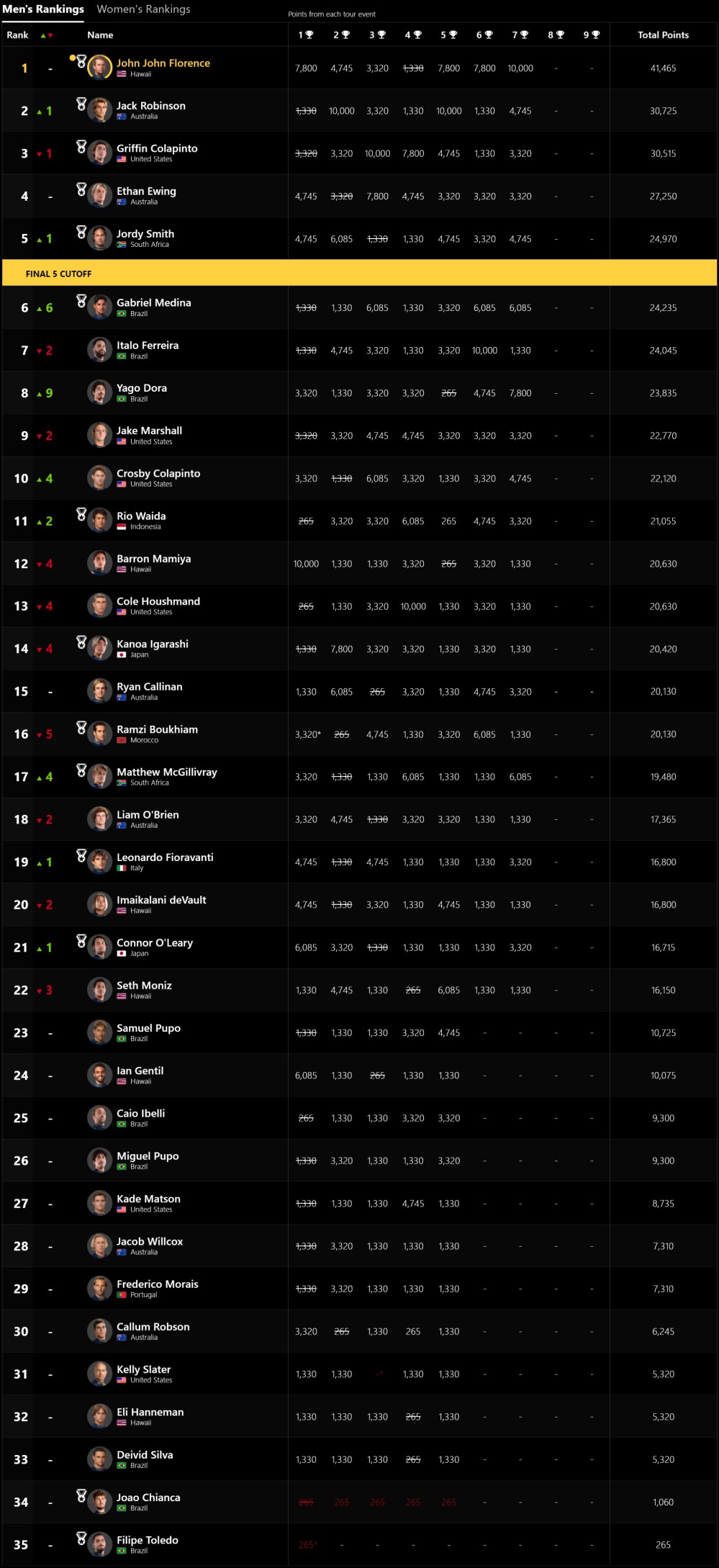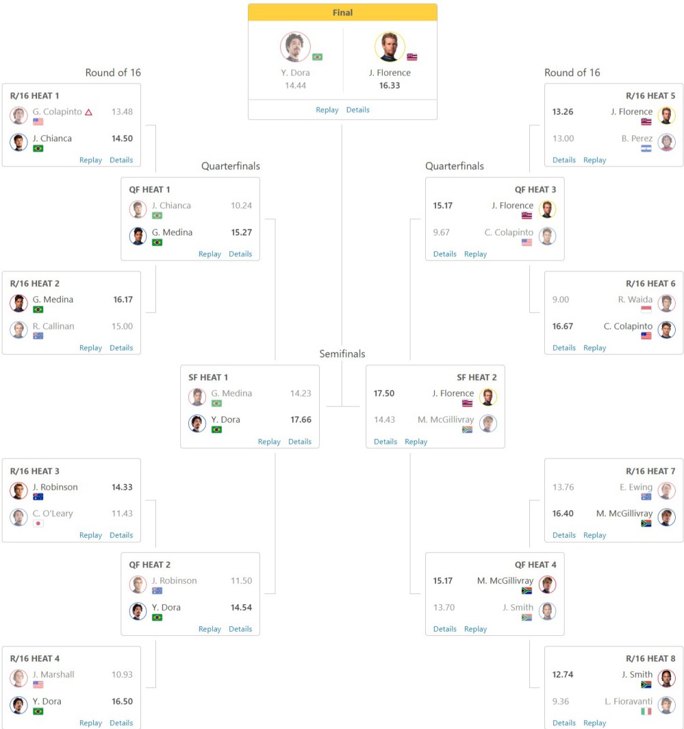 マシューも意地を見せてラストウェイブでは3回もエアリアルをメイクして7.93をマークしたものの、ジョンジョンのリードには追い付くことができませんでした。