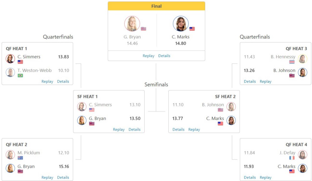 このヒートはキャロリンの波選びがずば抜けて良かった印象で、早い波が多い中でオープンフェイスを選び抜いた点が勝敗を分けたと言えるでしょう。