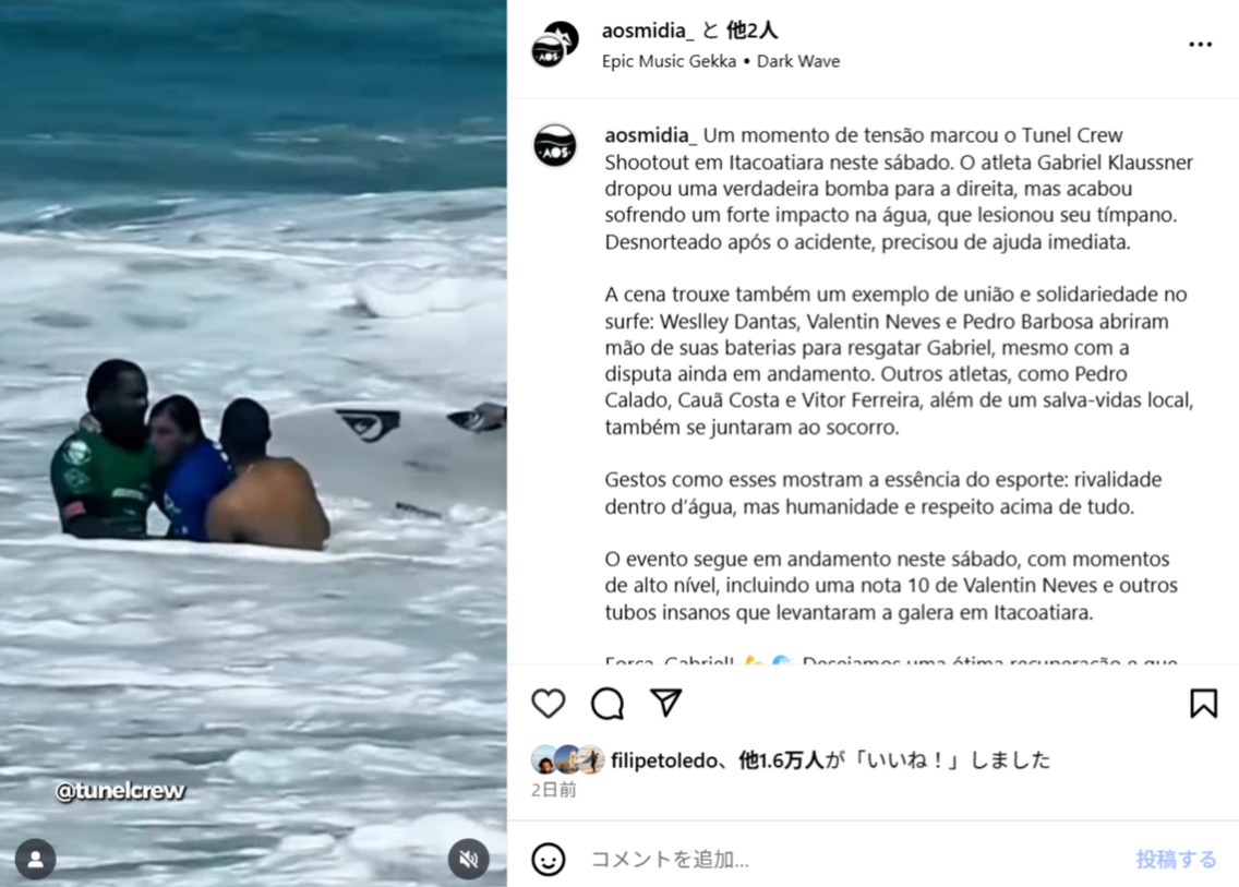 今回の記事は、ガブリエル・クラウスナーのアクシデント、そして対戦相手であるサーファーたちの救助劇と言った感動のストーリーのニュースをお届けします。