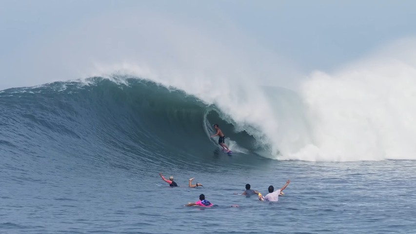 リッジは2本もサーフボードを折る結果となるほどヘビーコンディションの中、最終的に兄であるカイのサーフボードを借りて最高なバレルライドをメイクすることに成功。