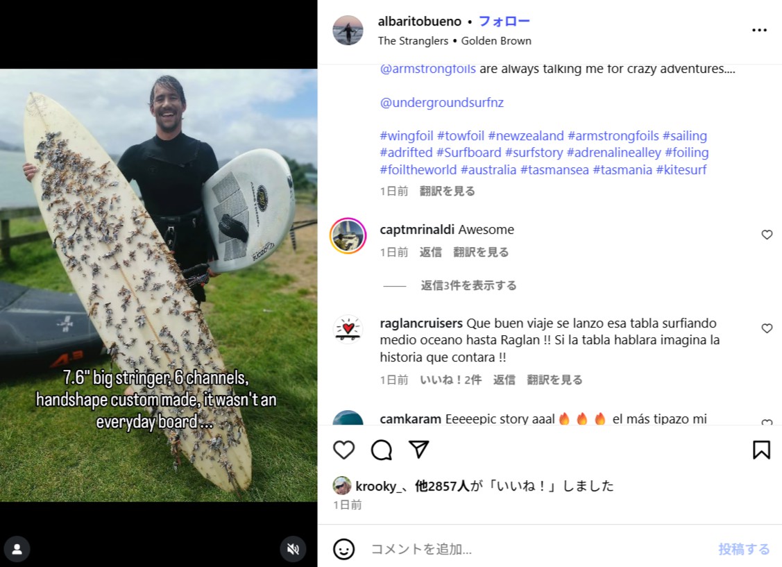 参照記事「Surfboard found intact in New Zealand after being lost in Tasmania in 2024」