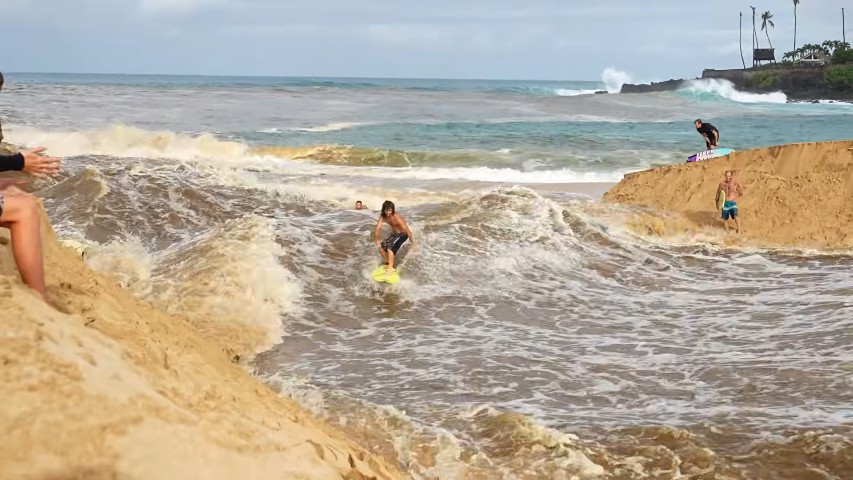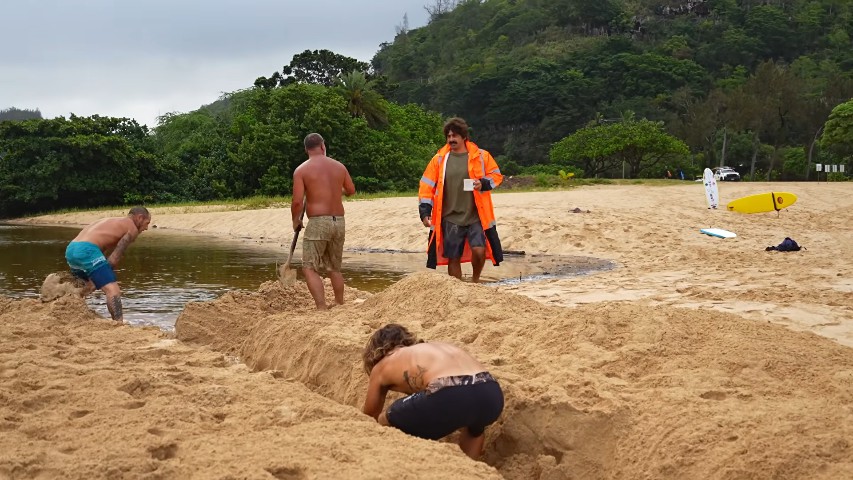 動画では実際にビーチを掘り起こして水が流れ出す過程から、リバーサーフィンできるようになるまでの様子を収録しています。
