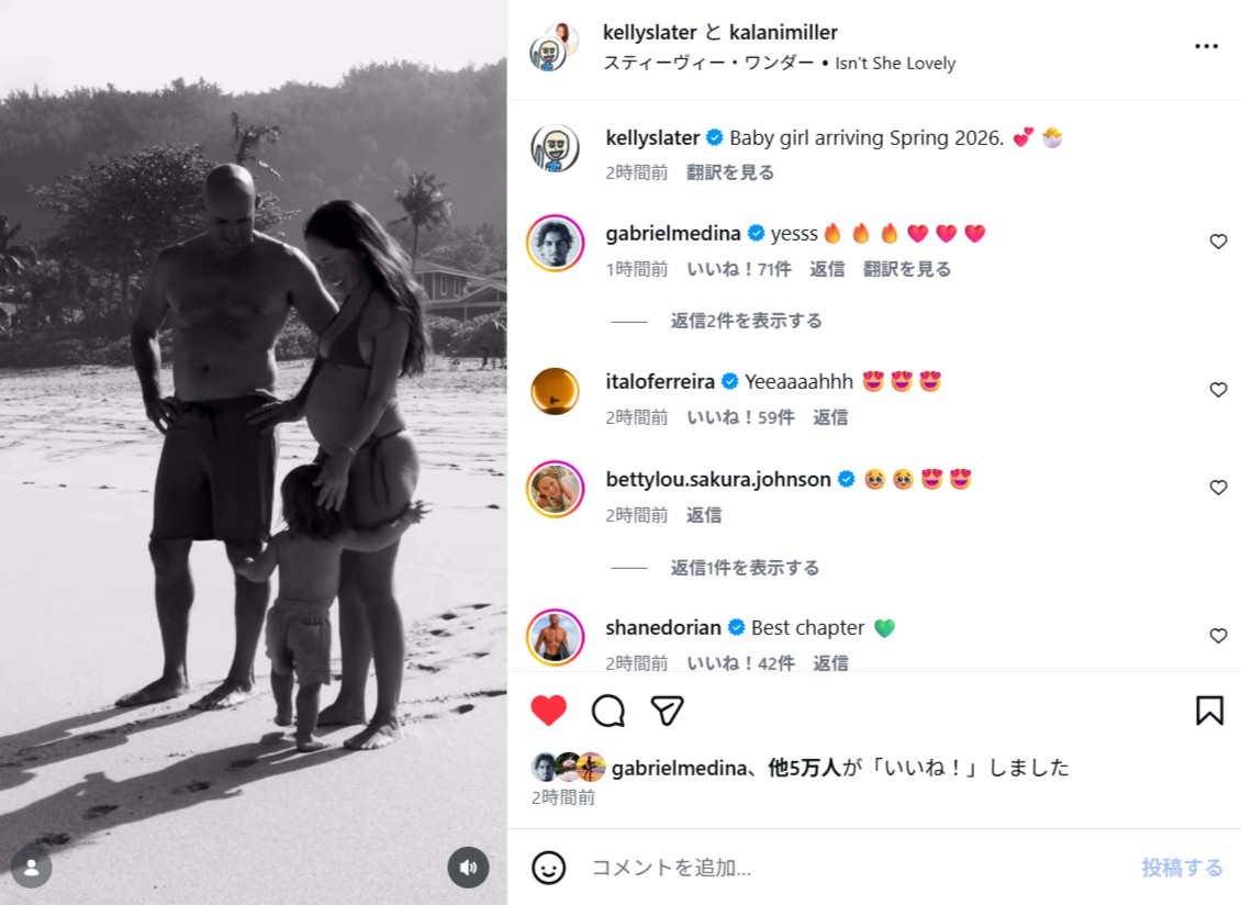 今回の記事は、ケリー・スレーターのパートナーであるカラニ・ミラーが二人の間では第二子となる女の子を妊娠したニュースをお届けします。