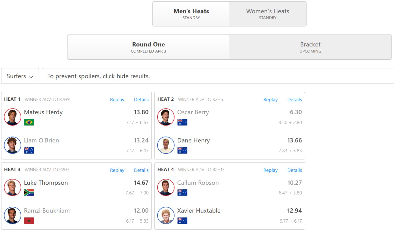 ラウンド1でイベント敗退となったのは、ヒート順にリアム・オブライエン、オスカー・ベリー・ラムジ・ボウキアム、カラム・ロブソンの4名。
