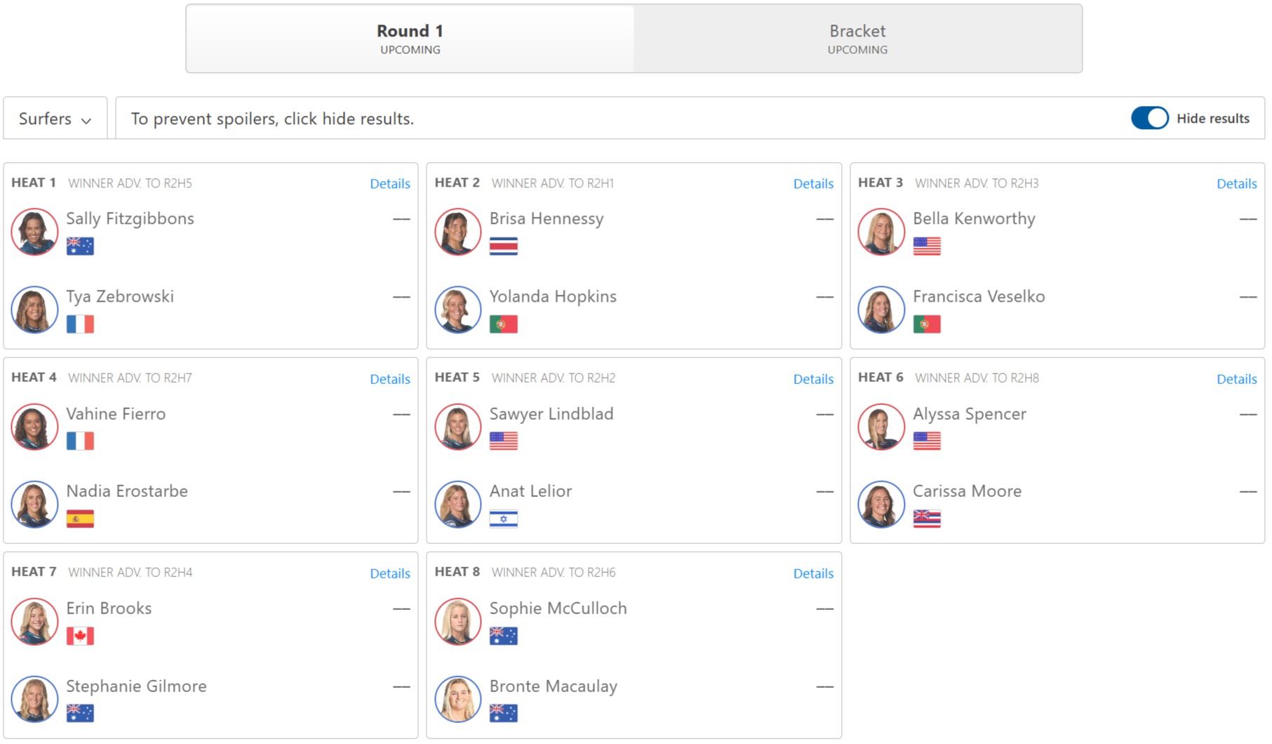 タイラーからソフィーに変更した後に発表されたウイメンズのラウンド1のヒート表は以下となります。