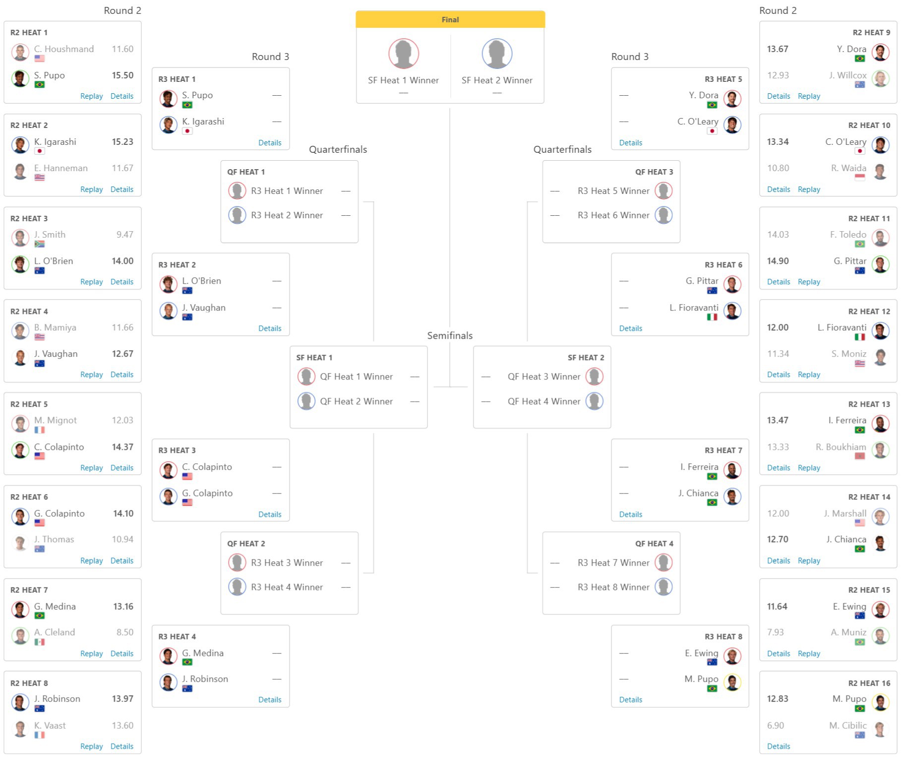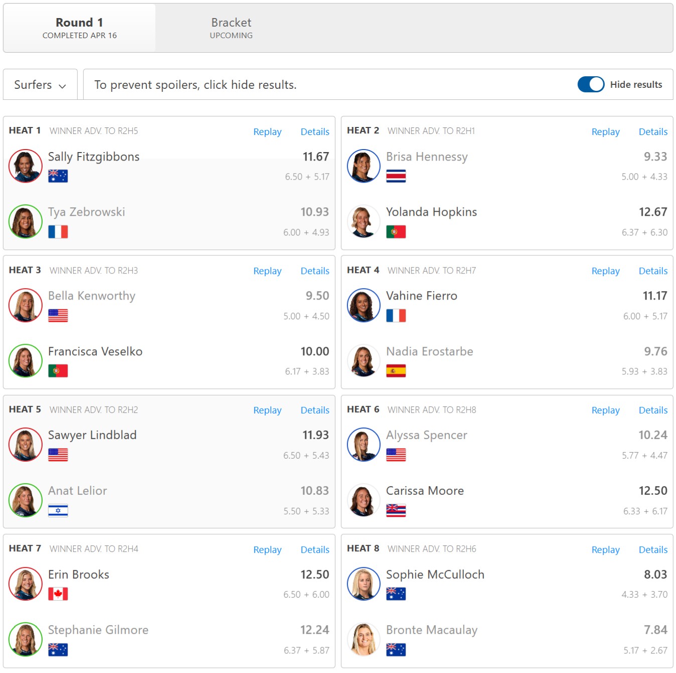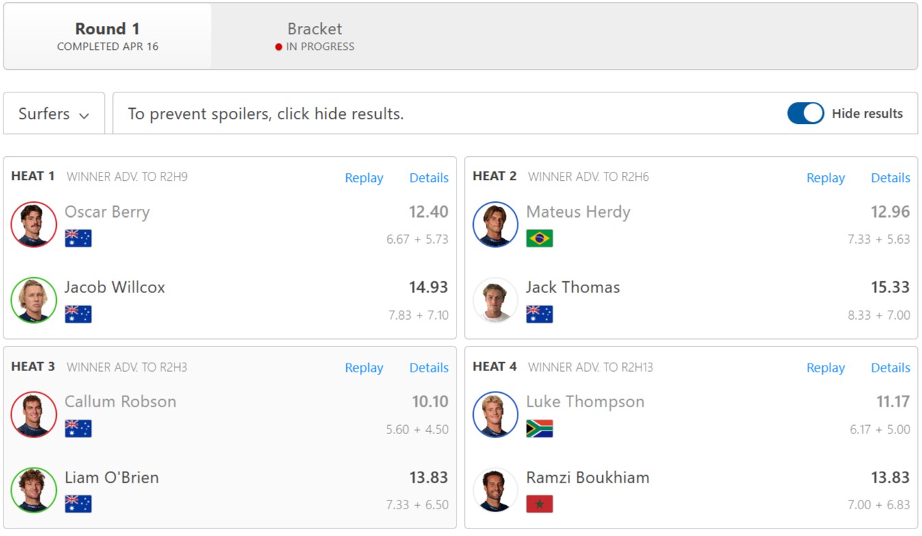 本日ラウンド1で敗退して1コケとなってしまったサーファーは、ヒート順に以下の通り。
